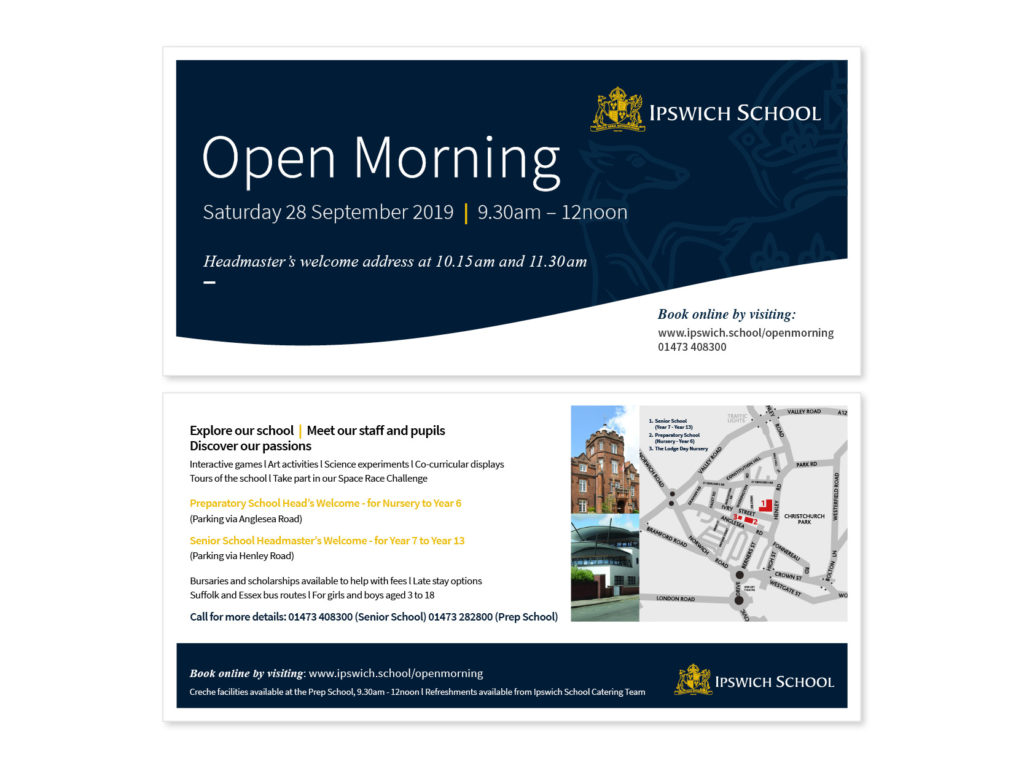 The location and placement of the Ipswich School logos depends on the type of template and the logo variation being used. The logo area has been defined in each template, where possible the logo should remain in this defined area. For further guidance of logo usage, navigate to theĀ Logo area of BrandBag.